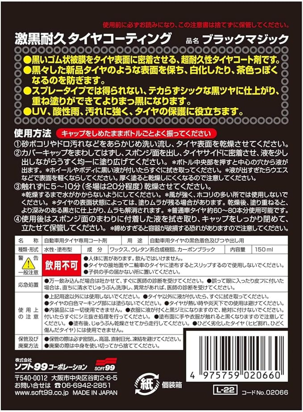 ソフト99(SOFT99) 足回りケア タイヤお手入れ クリーナー ブラックマジック 150ml 自動車用タイヤの黒色着色及び艶出し用 02066