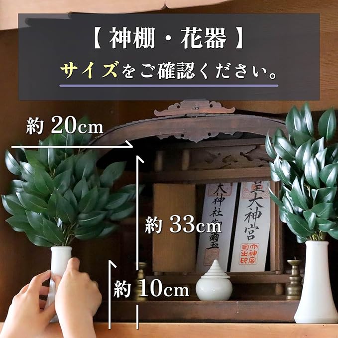 CT触媒加工を施しているため、消臭分解、抗菌、空気清浄作用や、榊に埃が付きづらい防汚効果があります。 光触媒加工と異なり、光が当たらない場所でも効果を発揮します。 サイズ:高さ33cm 幅20cm(水上約23cm)