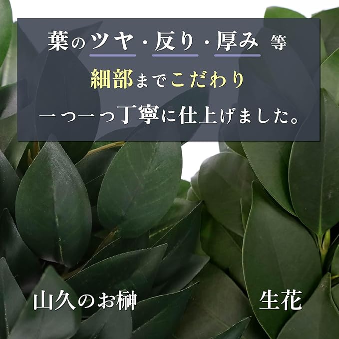 造花ですが、葉っぱに厚み、本物のような光沢やつやがあり、葉脈も再現されているため、神棚にお供えした時に本物のような見栄えがします。 1束に3本、一対で6本の枝を使っているため、葉の数が多くボリュームがあります。
