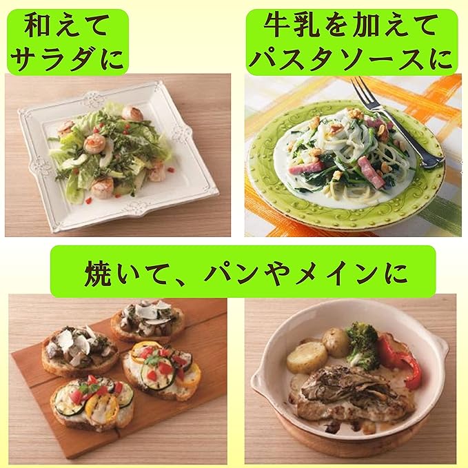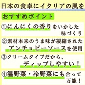 原材料:植物油脂、アンチョビーソース、醸造酢、ぶどう糖果糖液糖、にんにく、食塩、卵黄、卵たん白加水分解物、さとうきび抽出物、調味料(アミノ酸等)、増粘剤(加工でん粉、キサンタンガム)、香料、甘味料(ステビア)、香辛料抽出物、(原材料の一部にいか・さけ・大豆・りんごを含む)