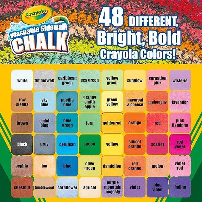 世界20ヶ国以上で愛され100年以上の歴史を持つクレヨンメーカー「クレヨラ (Crayola)」のWashable Sidewalk CHALK 48は、発色の良いチョークが48色セットになったジャンボチョークです。