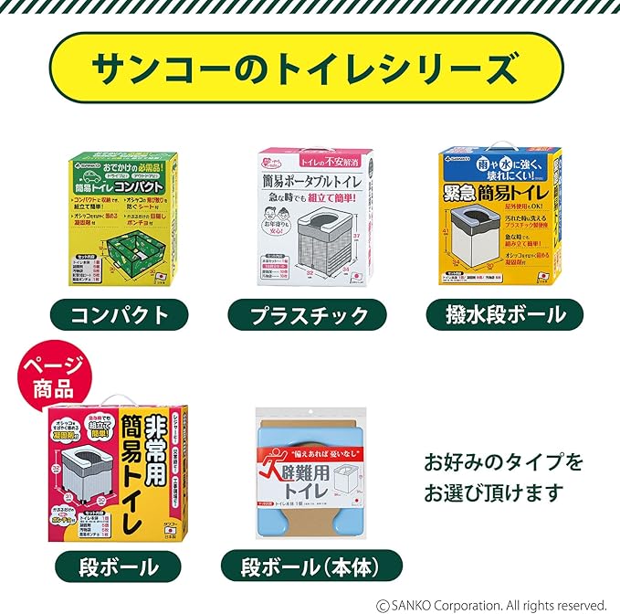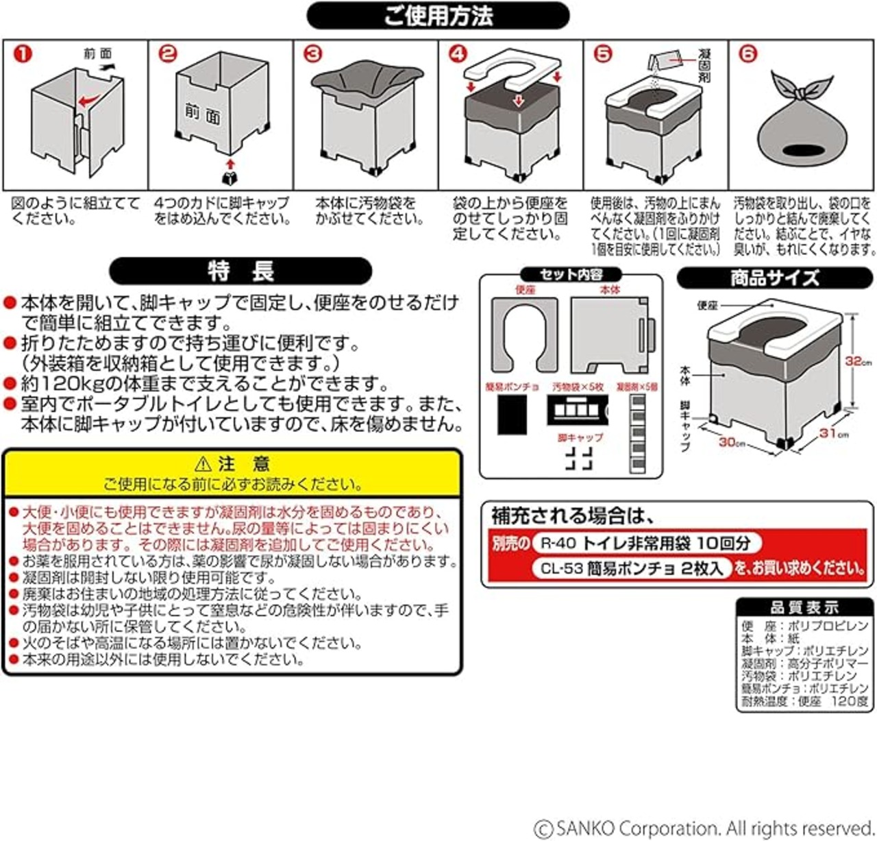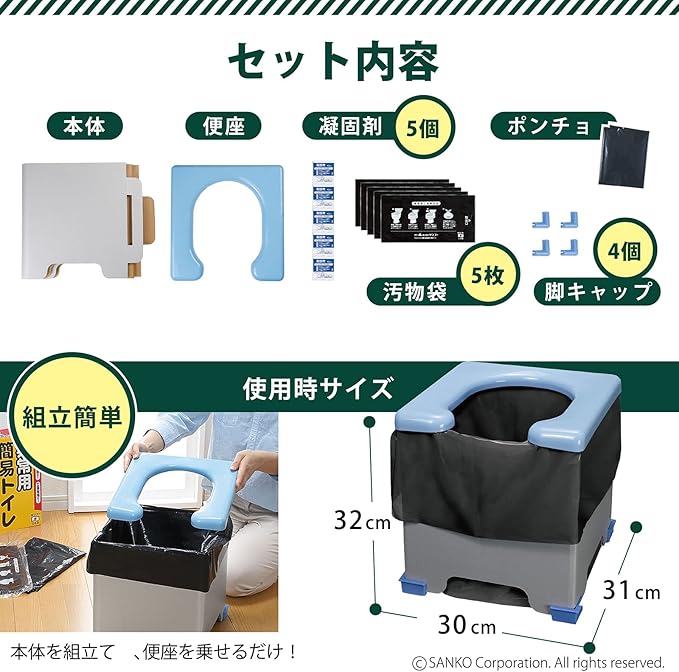 【素材】便座/ポリプロピレン、本体/紙、脚キャップ/ポリエチレン、凝固剤/高分子ポリマー、汚物袋/ポリエチレン、簡易ポンチョ/ポリエチレン