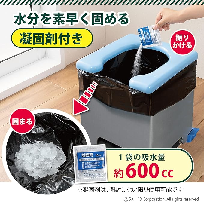 【凝固剤】約600ccの水分を固める。開封しない限り使用可能(高温多湿の場所では保管しないでください)