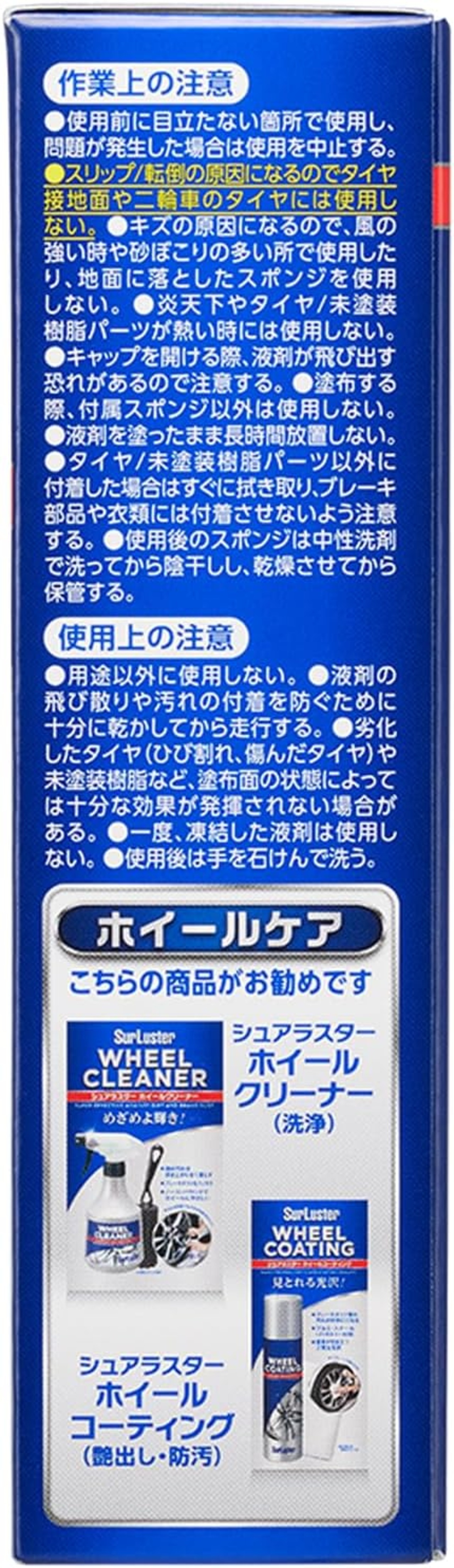 SurLuster(シュアラスター) タイヤコーティング+R 100ml 水性 塗りこみ 耐久性約6ヶ月 タイヤの艶出し 光沢 保護 ひび割れ防止 シリコーンオイル 乳液タイプ スポンジ付き 未塗装樹脂 中性 S-89