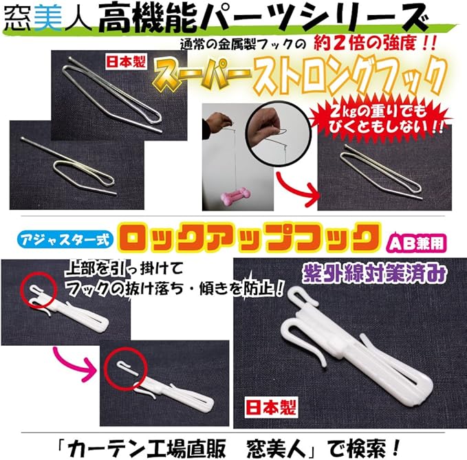 【金属製】安心の日本製!!焼入れ処理済み!耐久性バツグン!オーダーカーテンにも使用される高級カーテンフック! 90mm Bフック(レールを隠すタイプ) 8個入り