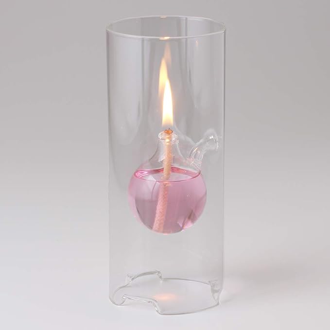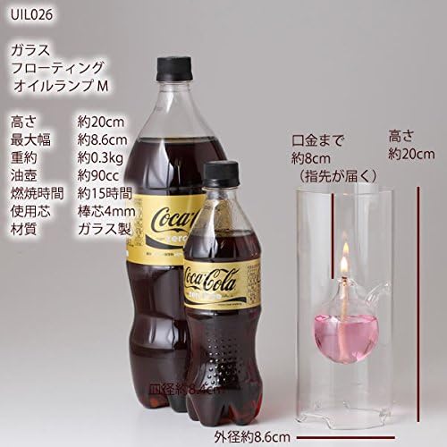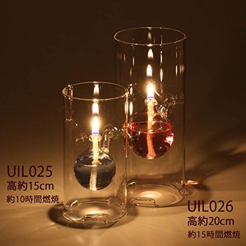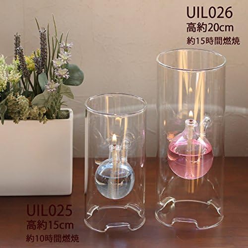 職人のバーナーワークのさえる、大変涼しげで、シンプルな不思議なデザインのオイルランプです。(ちょうどオイルタンクが宙に浮いたようなデザインです。燃料はボディ側部より注入します)点火したときの炎の揺らぎと、ボディを通して作られる独特の影は幻想的です。芯はメンテナンスフリーのガラス芯でほとんど消耗するることなくお使いいただけます。燃料の注入口が小さいため”注ぎ口付”のレインボーオイル、フレグランスオイルがおすすめです。またオイル注入器(CPS550)もご利用ください。プレゼント、またレストラン等のお店でのご使用におススメです。幅約8.6cm 奥行約8.6cm高さ約20cm(商品によりばらつきがあります。)燃焼時間 約15時間 グラスファイバー芯4mm1本(約15cm)オマケ!(本体付属の芯は綿芯ですが、耐久性の高いガラス芯をおまけでお付けします。)ガラス芯、ガラスの口金等の補修部品もあります。こちらの商品はオイル別売りです。オイルが必要な場合は別商品のオイルセットまたは別売りのレインボーオイルをご注文ください。