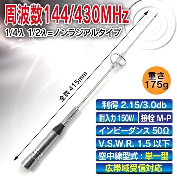 【周波数】 144/430MHz(1/4λ 1/2λ=ノンラジアルtype) 【利得】 2.15/3.0db 【耐入力】 150W