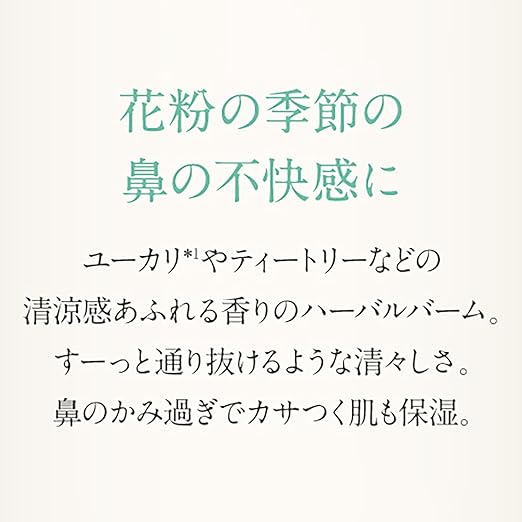 商品特長 思わず深呼吸したくなるほど、清涼感あふれるスーッと爽やかな香りの塗るケア。ユーカリやティートリーの相性抜群の香りが通り抜けるような清々しさをもたらします。鼻がつまる・頻繁に鼻をかみ肌があれてしまうとき、鼻のまわりに塗って快適に。 表示を増やす