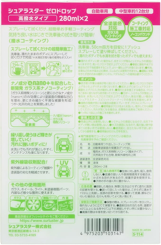 SurLuster(シュアラスター) ゼロドロップ バリューパック 詰め替え 280ml 2本 撥水 ガラス系コーティング 約2ヶ月耐久 艶 光沢 紫外線吸収剤 UV 保護 車 バイク 自転車 簡単施工 洗車 スプレーコーティング S-114