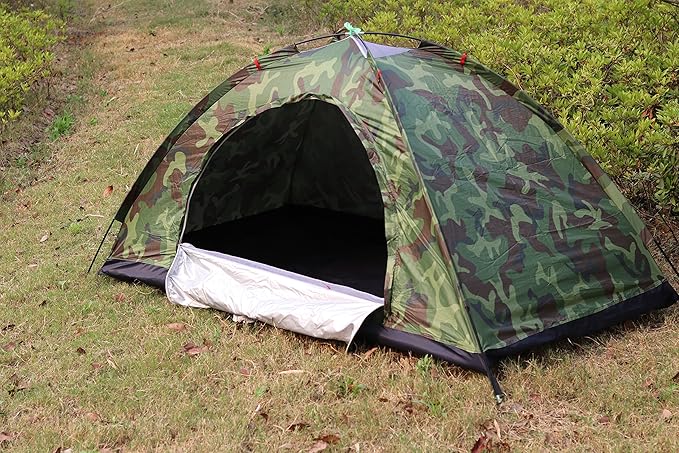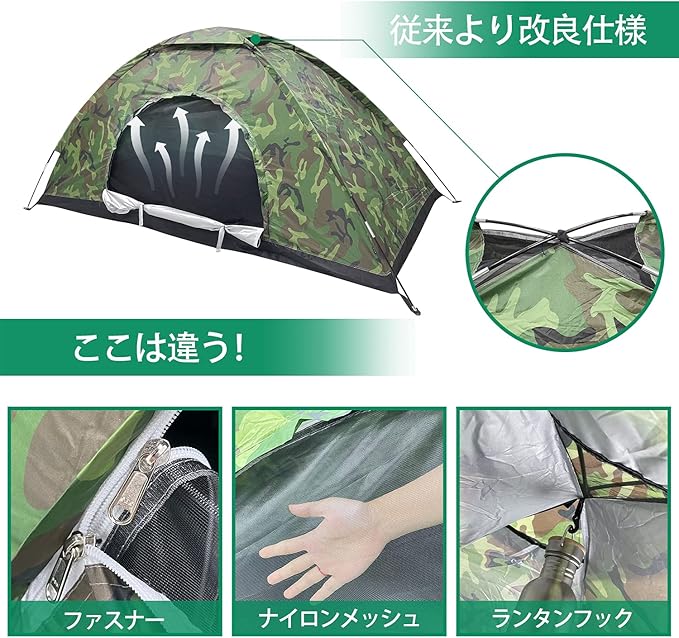 【コスパ抜群】テント本体+ポール2本+ペグ4本+収納袋の完全装備セット。カモフラージュ柄で自然に溶け込むデザインと、アウトドア初心者に最適なコストパフォーマンスを実現。
