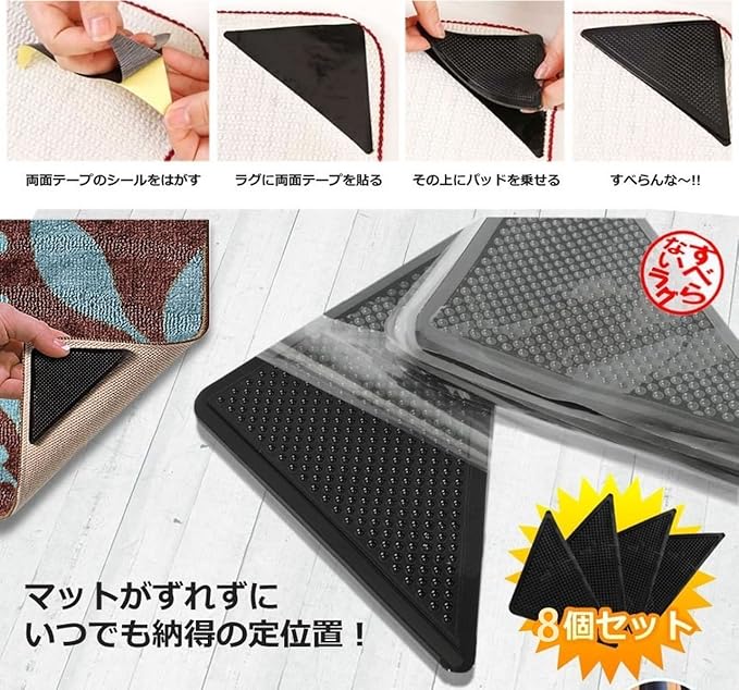 LUCKYBEE 超強力 ラグマット すべり止め カーペット 固定 シート すべらない パッド 自宅 ラグ 絨毯 フロア バス 玄関 マット 転倒防止 カーペット 四隅 滑り止め 簡単 カンタン 貼る だけ 粘着(8枚入り)
