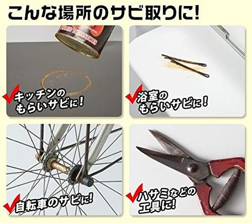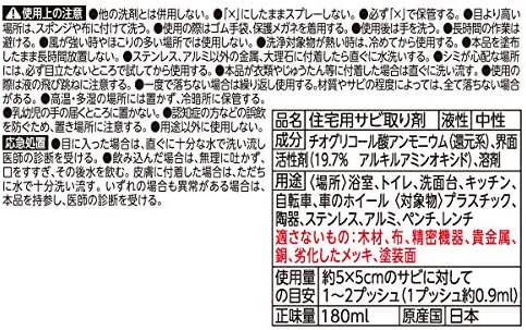 【商品仕様】内容量/180ml 、成分/チオグリコール酸アンモニウム(還元系)・界面活性剤(19.7% アルキルアミンオキシド)・溶剤 、液性/中性、用途/(場所)浴室・トイレ・洗面台・キッチン・自転車・車のホイール(対象物)プラスチック・陶器・ステンレス・アルミ・ベンチ・レンチ、使用量目安/約5 5cmのサビに対して1〜2プッシュ(1プッシュ約0.9ml)、原産国/日本