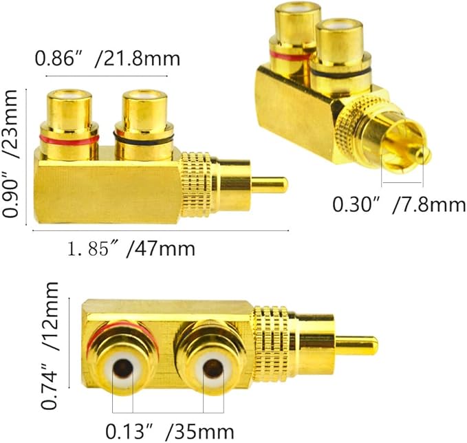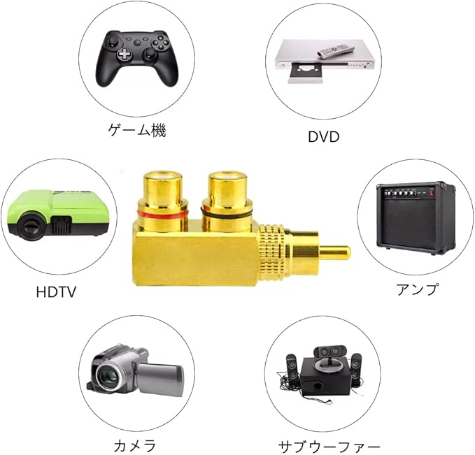 1RCAオス-2RCAメス分岐アダプター。サブウーファー接続やその他のアプリケーションに最適です。