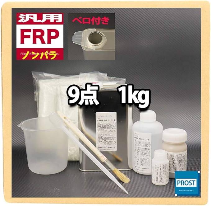 汎用 FRP補修9点キット 樹脂1kg 一般積層用 ノンパラフィン 硬化剤/ガラスマット/溶剤/ポリパテ/クロス/道具付
