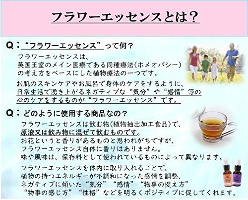 【フラワーエッセンスとは・・】個々の感情のバランスのを優しく整えてくれるお花のエッセンスです。副作用や依存の心配なくご使用いただけます。お天然植物の力で癒しの効果を体験しませんか?【DTWフラワーエッセンスフォーミュラとは・・】それぞれの目的に合わせて、効果を最大限に引き出すよう選び出されたフラワーエッセンスをブレンドしたものです。目的に合わせて今の貴方にピッタリなものをお選びください。【ポイント】エッセンシャルオイルやアロマオイル(精油)に含まれているような物質的なものは含まれていないため、当店のグッズは、赤ちゃんからお年寄り、女性用(レディース)、男性用(メンズ)、植物、動物(ペット)にも安全に使用することができます。【主な用途】癒し、花療法、セラピー、入浴の際や、フレーバーウォーター、フレーバーコーヒー、フレーバーティーなどと合わせておしゃれなオトナ女子(男子)になりましょう♪