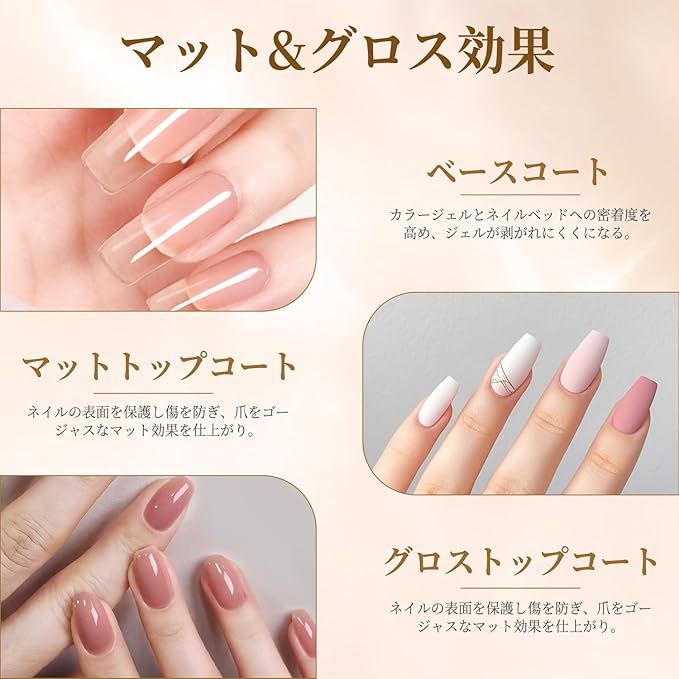 ネイルに2つの仕上がり効果を与えます:このマットとシャインジェルトップコートセットは、マニキュアの仕上がりを2種類から選ぶことができます。トップコートは、爪にツヤを与え、擦れによる傷を防ぎます。マットトップコートは、驚くほどのマットな仕上がりになります