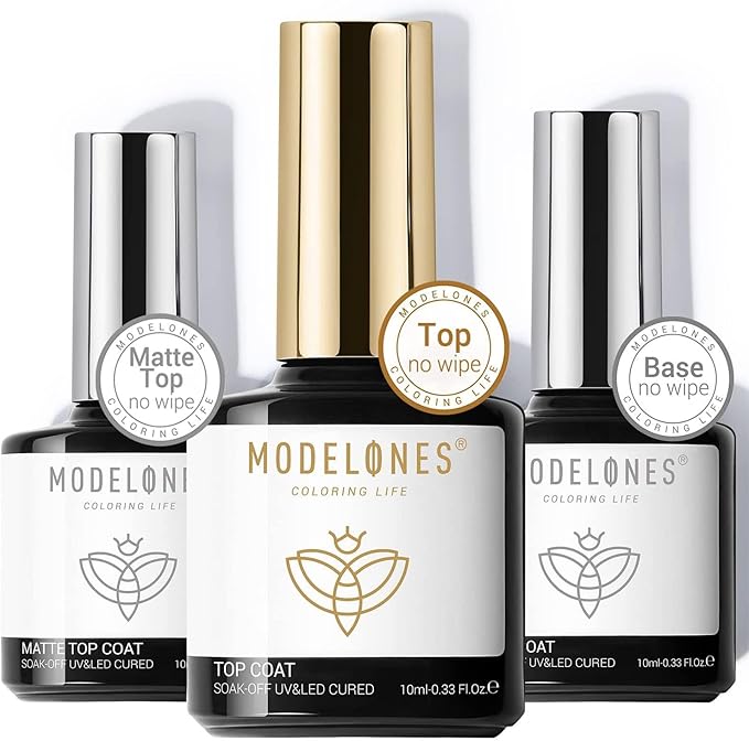 ベースとトップコートのセット:Modelones ベースコートとノーワイプジェルトップコートのセットです。ベースコート1*10 mlとノーワイプシャイントップコート1*10 mlとマットトップコート1*10 mlをギフトボックス付きでお届けします。ベースコートやカラージェルは硬化後に少しベタつきが残ることがありますので、ご注意してください。また、爪とジェルの密着度が高いので、トップコートを使ってそれを封じます。ヒント:硬化しすぎると剥がれやすくなりますので、ご注意ください