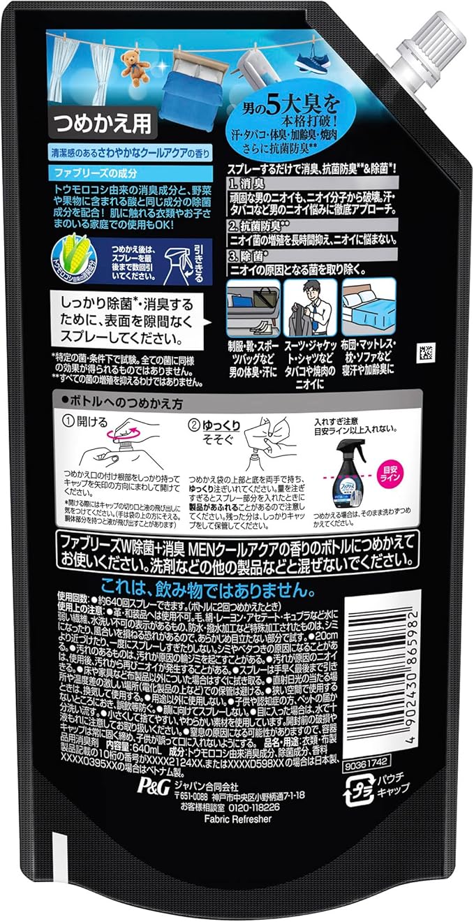 ファブリーズ ファブリーズメン 除菌消臭スプレー 布用 クールアクアの香り 詰め替え 大容量 640 ミリリットル
