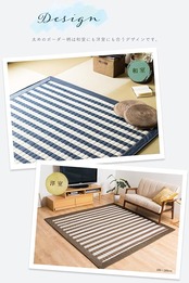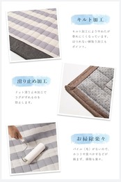 いつでもひんやりサラサラで夏にぴったり。爽やかさを感じさせるデザインで見た目から涼しくなるラグです。【いつでもひんやり接触冷感素材】接触冷感素材を使用しているので、触れた瞬間、ひんやり。熱を素早く発散し肌にベタつきません。【抗菌防臭加工】細菌の増殖を抑制し、防臭効果を発揮!衛生的に使用できてお子様にも安心です。【洗濯可能】いつでも清潔にお使いいただけます。【キルト加工】キルト加工により、中綿が寄れにくくなっています。ほつれない縁取り加工もポイント。【滑り止め加工】ドット滑り止め加工でラグがずれるのを防止します。【お掃除楽々】パイル(毛)がないので、ホコリや食べかすなどがからまず、お掃除も楽々。【おしゃれなボーダーデザイン】太めのボーダー柄は和室にも洋室にも合うデザインです。