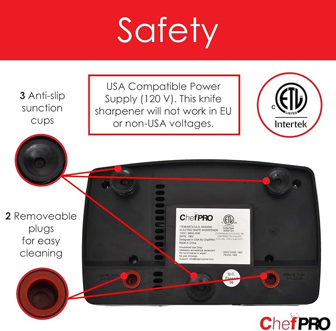 片付けがとても簡単:Chef Proの電動キッチンナイフ研ぎ器は、散らかったゴミを掃除する時間を節約します。 簡単に取り外せるプラグが付いた、散らかりにくい容器は、金属の破片やファイリングをキャッチします。 ただ投げるだけです。