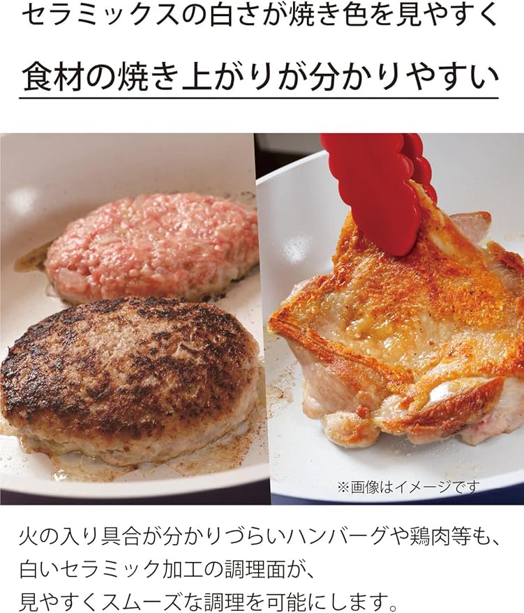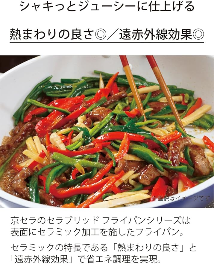 セラミック加工は熱まわりが良く、遠赤外線効果によって、中火でもしっかり火が通り食材の芯まで熱が届く。肉料理をジューシーに、野菜炒めをシャキッと仕上げる。汚れが付きにくくお手入れも簡単です。