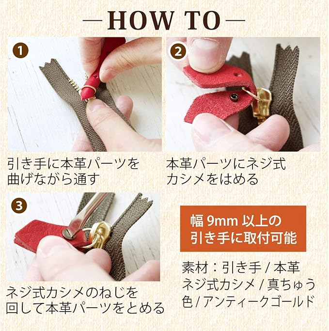 簡単に取り付けられる本革のファスナーパーツ。