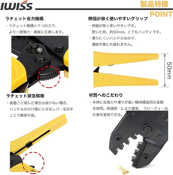 特徴:①芯線と被覆同時圧着、②ラチェット機構、③ラチェット緊急解除