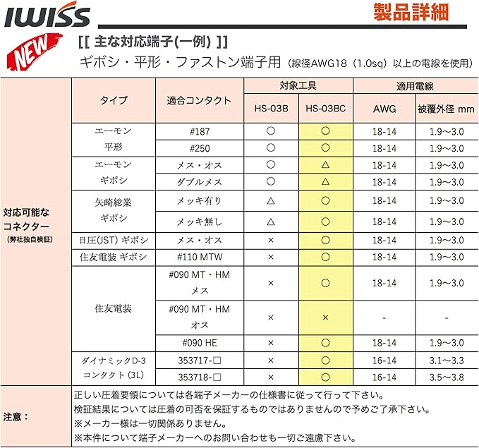 圧着能力:0.5-6.0mm (AWG20-10) *注:mm ≒sq(*重要:ギボシ、平形端子の圧着に使用される場合、線径φ1.0sq以上の電線をご使用ください)