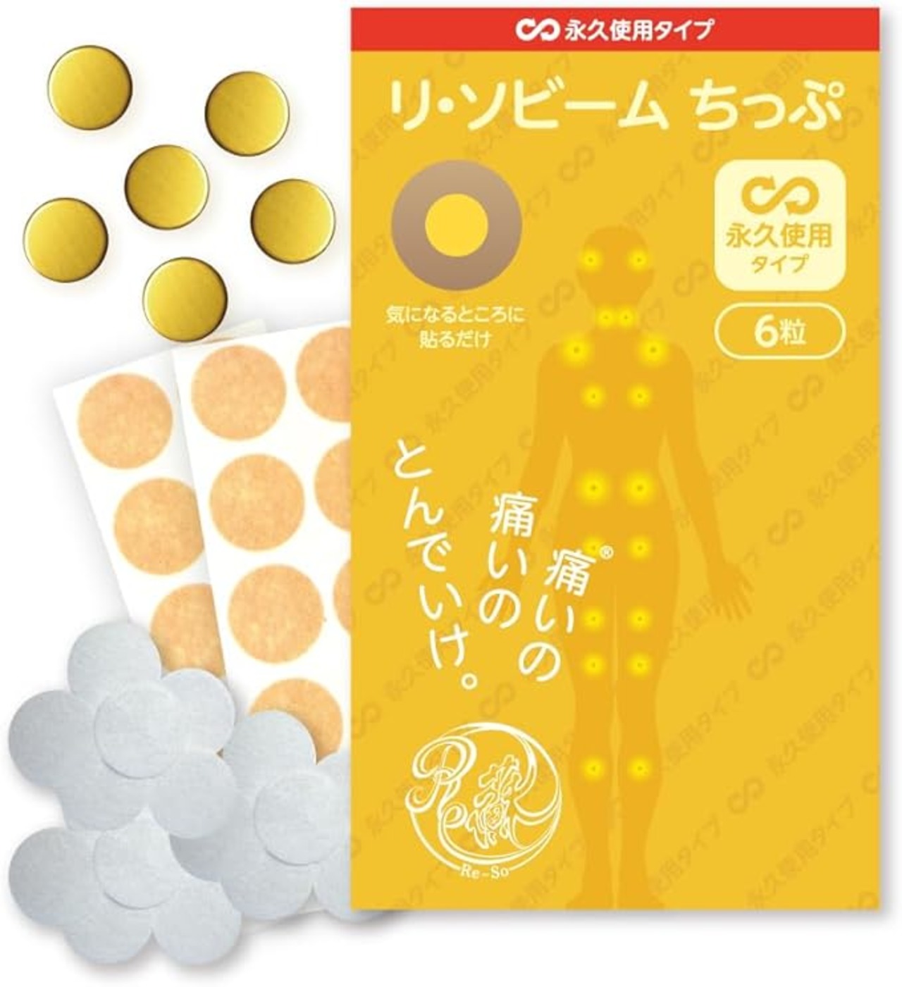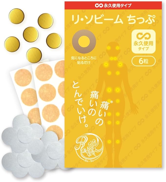 【内容】リ・ソビーム ちっぷ 永久使用タイプ 6粒、・貼りかえ用シール 24枚 ・かぶれ防止シート 24枚 ・ツボ図 ※ちっぷはシールから剥がして繰り返し使用できます。【成分】Re-Soテクノロジーを施した塩(NaCl)、ミネラル群溶液+酵素群溶液