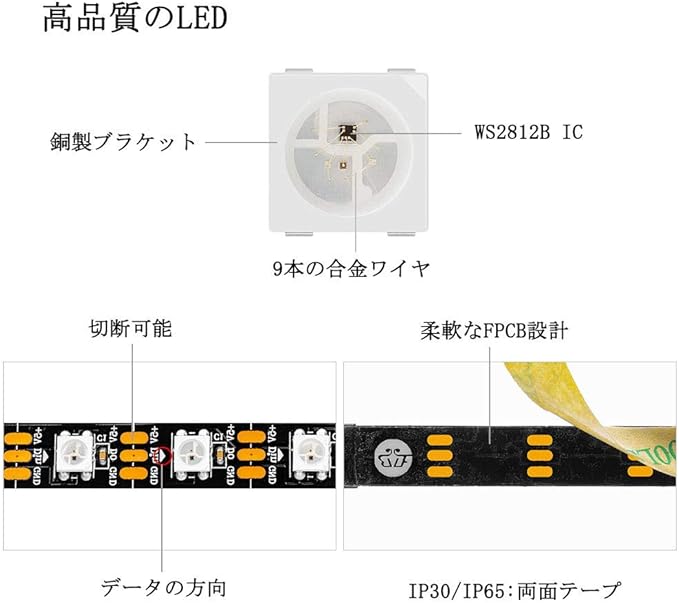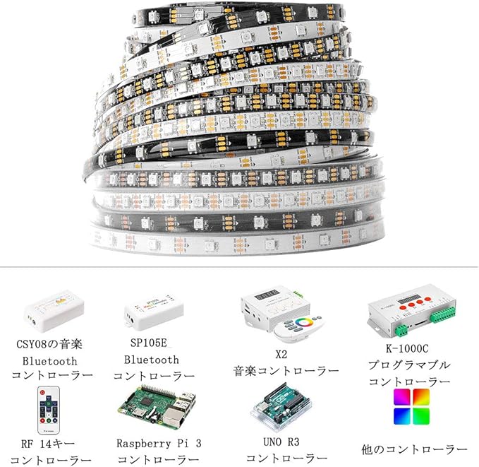 「簡単にプログラム可能」WS2812BのテープライトはArduino, Raspberry Pi, Teensy, T1000S, K1000Cなどのプログラムによって駆動されます。SP110E,SP105E,SP108E,SP601Eのアプリコントローラーを制御します。または、CSY07,CSY08,X2,SP106E,SP107Eの音楽コントローラーは利用して、WS2812Bのテープライトを制御することができます。