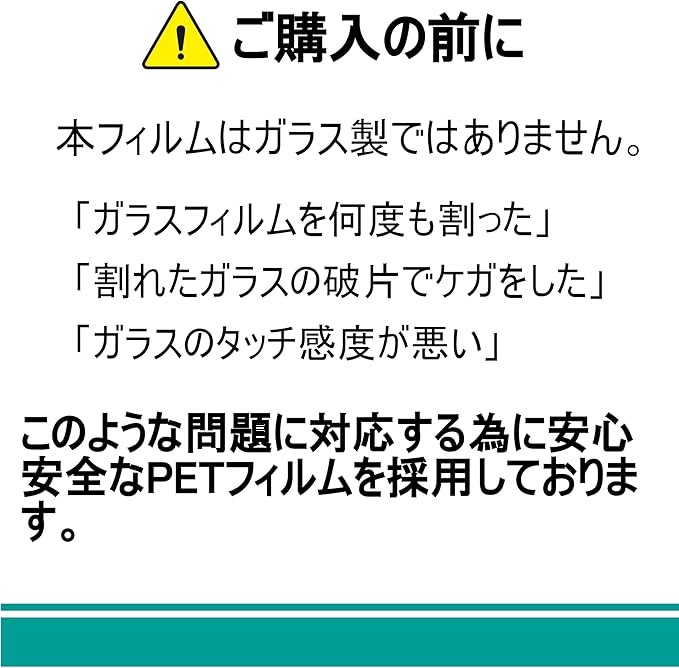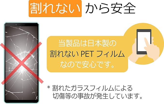 【割れないフィルム】 「ガラスフィルムを何度も割った」「割れたガラスの破片でケガをした」「ガラスのタッチ感度が悪い」このようなお客様の声をもとに安心、安全な日本製のPETフィルムを採用しております。