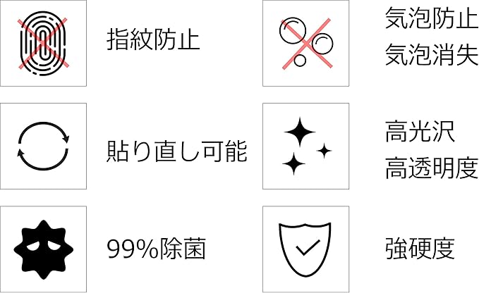 【気泡防止・消失】 吸着に優れた特殊なシリコン層により位置を合わせて置くだけで気泡が無くなります。仕上がりが美しくフィルム貼りが苦手という方にもピッタリです。時間の経過とともに気泡が目立たなくなる特殊吸着層を採用したエアレスタイプです。