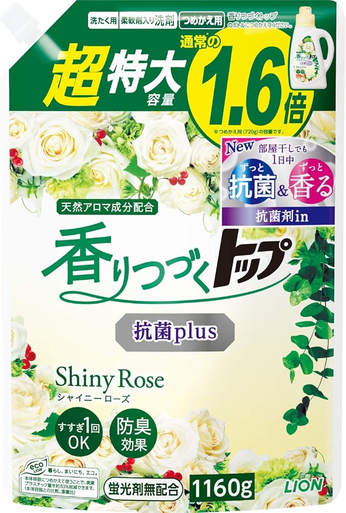 【大容量】香りつづくトップ 抗菌plus シャイニーローズ 蛍光剤無配合 柔軟剤入り洗濯洗剤 液体 詰め替え 超特大 1160g