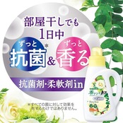 部屋干しでもイヤなニオイを抑えて、衣類だけでなくお部屋に広がる香りまで楽しめます。抗菌剤配合で、部屋干しでも1日中ずっと抗菌、ずっと香る柔軟剤入り洗濯洗剤・液体洗剤です