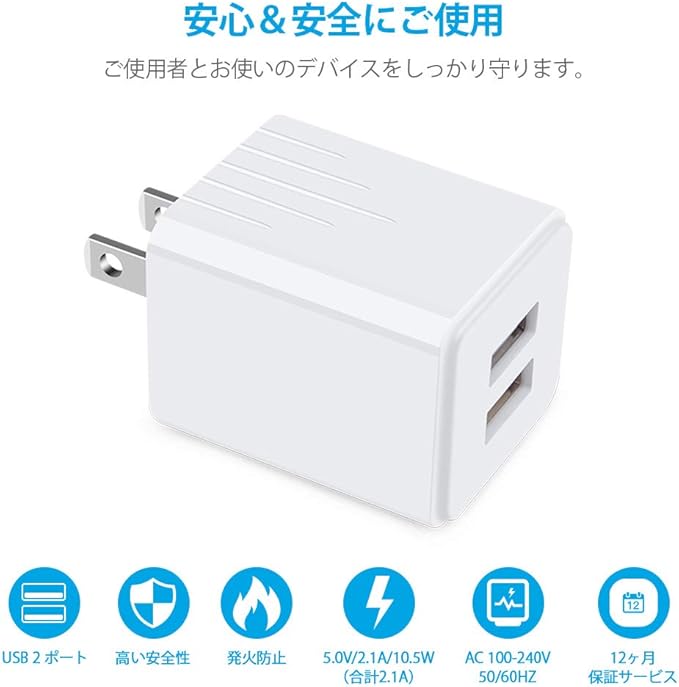 2ポートUSB急速充電器:Input:AC100-240V 50/60Hz 0.5A 、Output:DC5V/2.1A。2つのUSBポートを搭載しており、iPhone、Android、ゲーム機などの機器を2台同時に充電可能です。単ポートの最大出力電流が2.1Aで、スマホ充電時間を短縮可能です。又、AC100~240Vの電圧対応、海外でも使用可能です。お宅、オフィス、出張、旅行などに不可欠な好物です。(ご注意:機種によって急速充電マークを表示されない可能性があります。あらかじめご承知ください。又、2ポート同時使用時は、通常充電となります。)