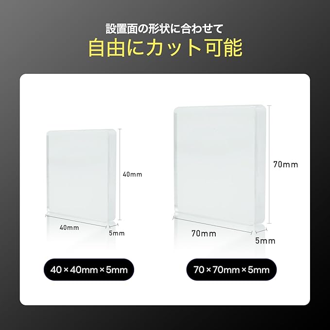 【選べるサイズ】目立たないクリアタイプ四角40mm/70mm。用途や設置面に合わせて選択可能。