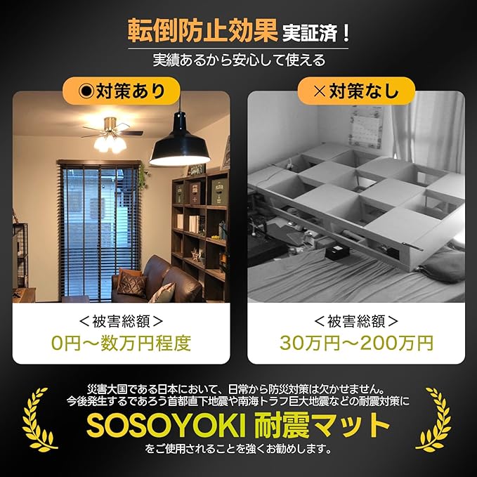 【耐震マット・プレミアム】1000ガル耐震試験をクリア、震度7クラスの大地震にも対応。4枚の設置で耐重荷100kg以上(一枚あたり25kg)耐荷重トップレベル。