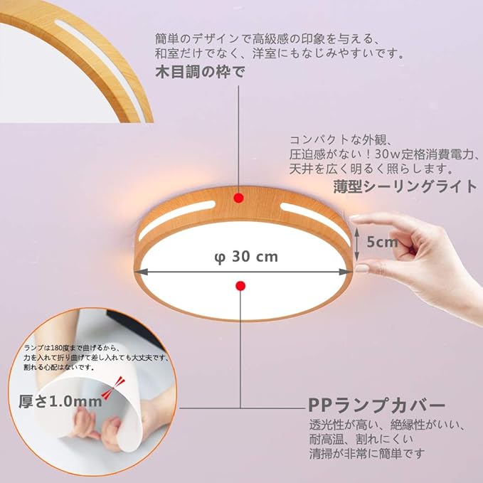 【木目調】シーリングライトは木目調ペンキの塗装、シンプルなファッション、様々な装飾スタイルに適しています!サイズ:直径300mm*高さ50mm、コンパクトな外観、圧迫感がない!簡単のデザインで高級感の印象を与える、和室だけでなく、洋室にもなじみやすいです。