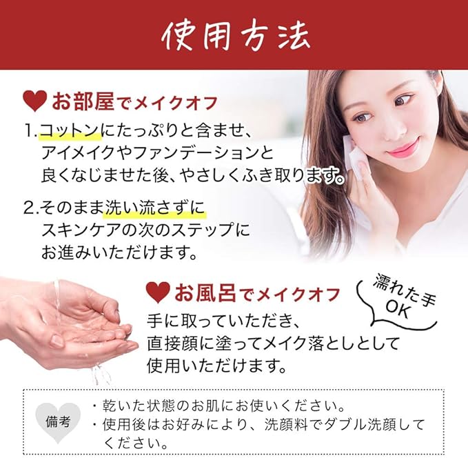 【簡単拭き取りクレンジング】 コットンにたっぷり含ませてふき取るだけでOKの、簡単ふきとり化粧水としてもお使いいただけます。洗顔不要なので、お部屋や水道がない場所での使用に便利な時短化粧落としです。失敗時のポイントメイク落としにも最適です。