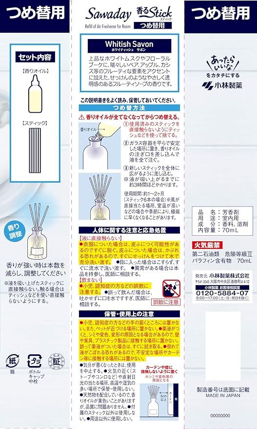 サワデー香るスティック SAVON(サボン) やさしいホワイティッシュサボンの香り 芳香剤 部屋用 詰め替え用 70ml ルームフレグランス 小林製薬