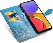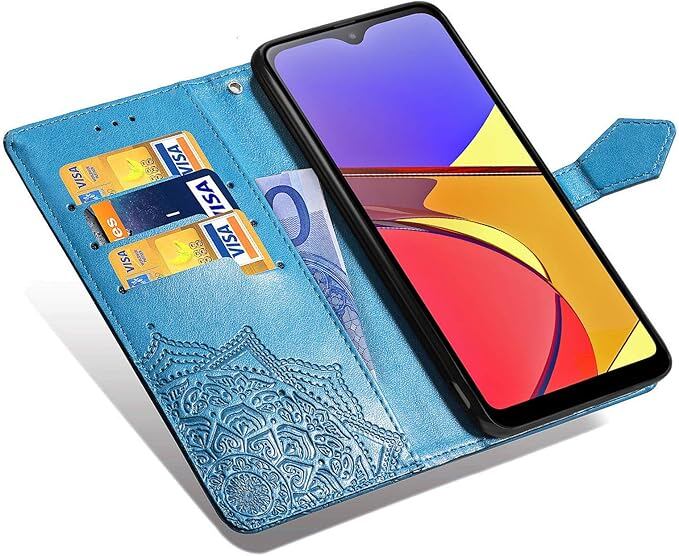 Galaxy A21 ケースキラキラ NTT ドコモ SC-42A ケース 高級PUレザーケース 手帳型 可愛いオシャレ au SCV49 横開きスマホケース カードポケット付き 財布型 純色 TPU 珍しげな花 ダツラ葉 simフリー galaxy a21 日本版スタンドカバー 耐衝撃 マグネット対応 装着やすい サムスン ギャラクシーA21 専用カバー ストラップ付き (Galaxy A21, ブルー)