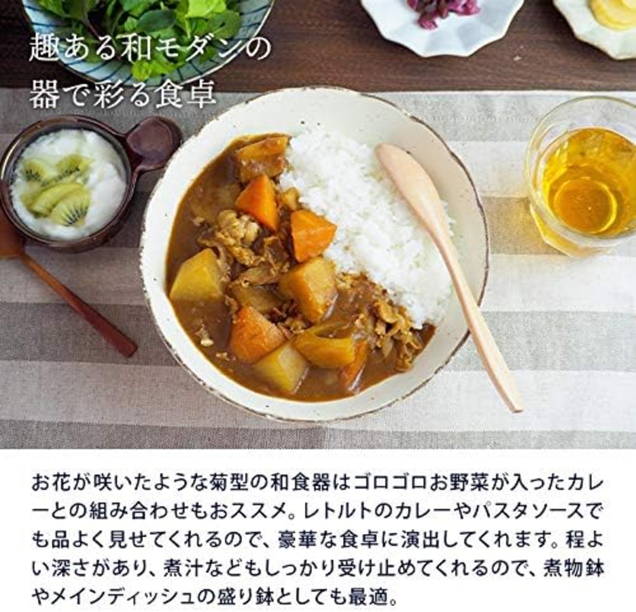 和風のお皿は食材を品よく見せてくれるので、レトルトのカレーやパスタソースでも豪華な食卓にしてくれるんですよ。 盛り鉢としてサラダやおかずの器としてもおすすめ。