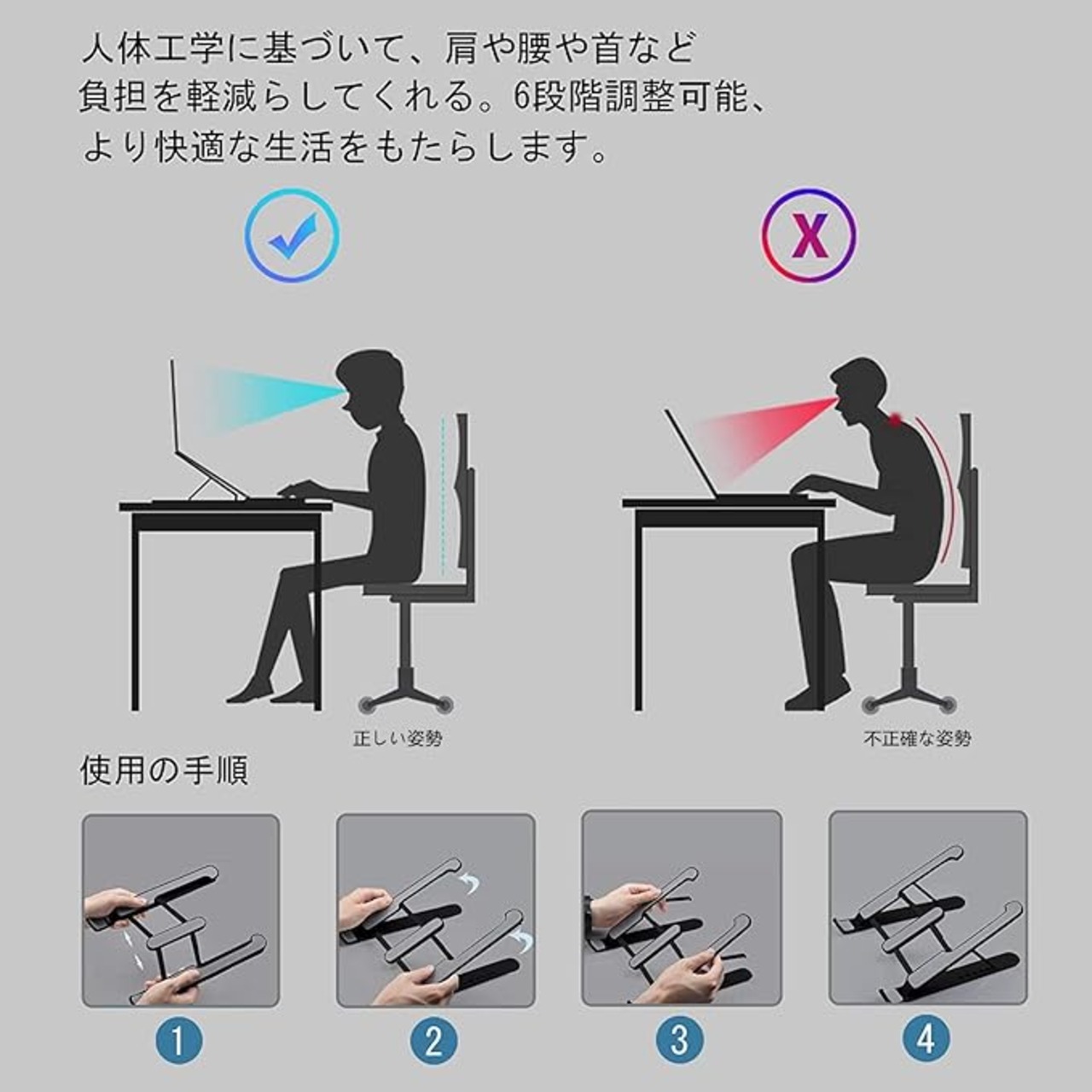 「6段階高さ調整・折りたたみ式&猫背防止」: pcスタッドは人体工学に基づいて、6段階高さ調整可能で、角度を20-40に調整できて、仕事中の姿勢を少しでも良くすることで首や腰などへの負担軽減に繋がり、猫背防止や腰痛軽減という副次的な効果があるだろうと考えています。無段階角度調整より、角度を調整する時、均等に力をいれて広げないと、ゆがみが出来るのとこは心配はありません。折りたたみ式で、収納袋も付いていて、軽くて持ち運び可能です。無料ギフト--1枚の携帯スタンドを贈る。