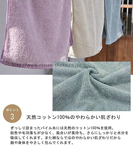 天然コットン100%のやわらかい肌ざわり ぎっしり詰まったパイル糸には天然のコットン100%を使用。 脱色や毛羽落ちが少なく、風合いが長持ち、さらにしっかりと水分を 吸収してくれます。また綿ならではのやわらかい肌ざわりだから 顔や身体をやさしく包んでくれます。