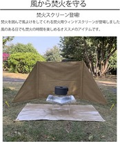 【風から焚火を守る陣幕型ウィンドスクリーン】風から焚き火の炎を守り、周りを火の粉から守ります。前方に熱を集中させることができ、より暖かく過ごせます。