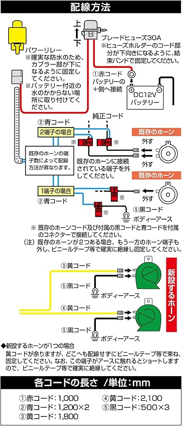 商品(左): 仕様 12Vホーン用/30Aまで対応可能 <br>●セット内容 ハーネス・パワーリレー、黒コード3本、コネクタ2個、結束バンド4本