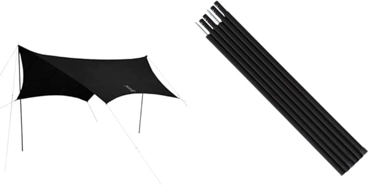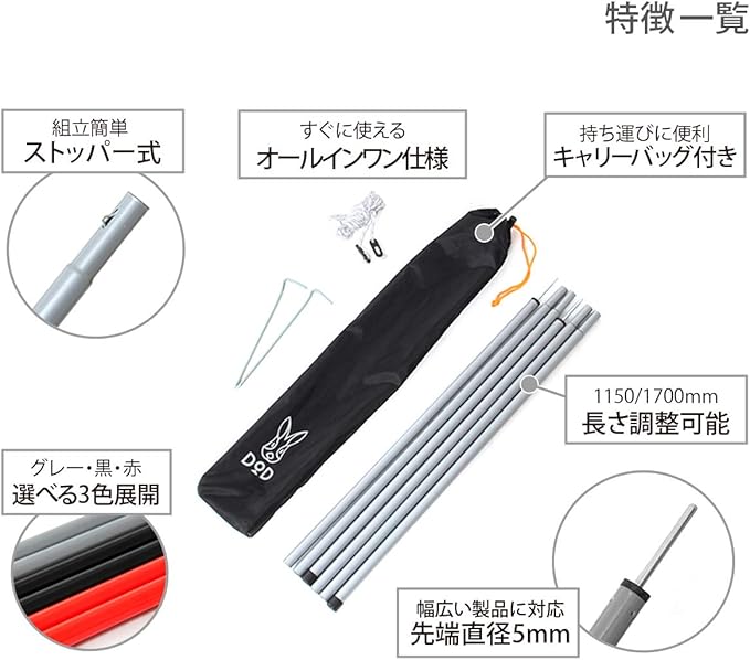 DOD(ディーオーディー) いつかのタープ はじめてでも扱いやすい ベーシックな ヘキサタープ オールインワン 延長テープ 標準付属 UV加工済 TT5-631-BK & テント タープポール 2本セット ペグ&ロープ&収納袋付 ブラック (約)直径1.5 長さ170cm XP-01K【セット買い】
