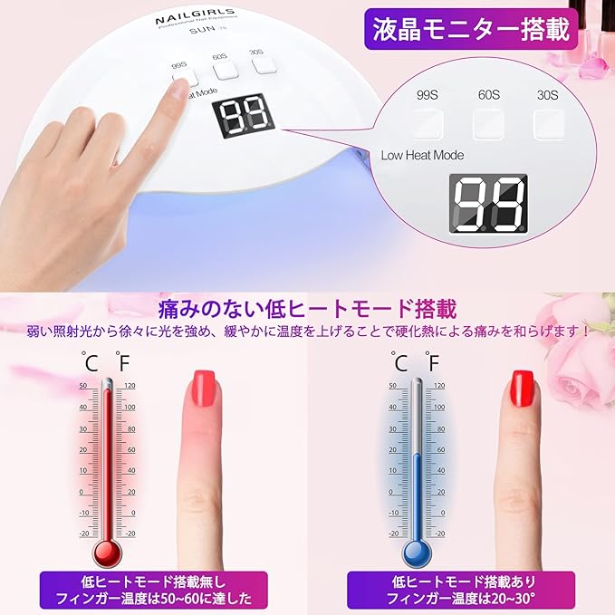 99s無痛モードで、痛みや熱に敏感する方にとても適合します。サロンに行かなくても、このLEDネイルライトを持って、自宅でジェルネイルを DIY できます。 ネイルランプは、ご家族やご友人へのギフトにも最適です。