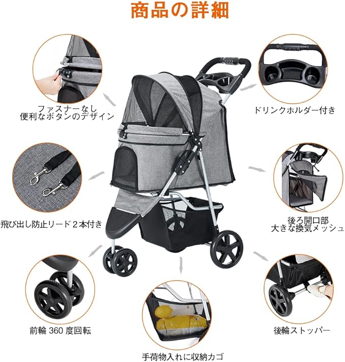 wangmao ペットカート 折りたたみ 3輪 犬用ベビーカー 猫犬兼用 多頭用 前輪360 回転 後輪ブレーキ付 組み立て簡単 介護用 ペットバギー 耐荷重15kg (グレー)