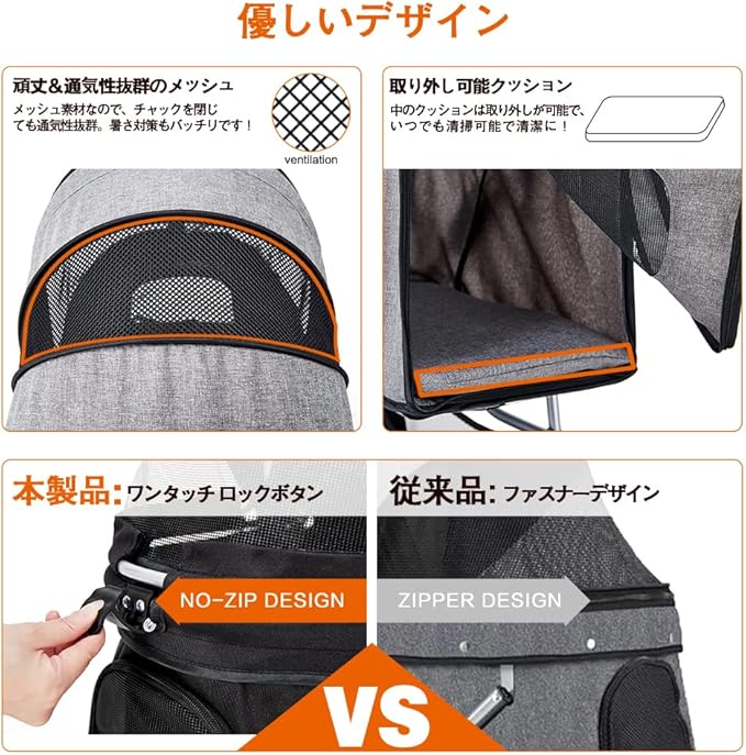 4面通気メッシュ:ケージ部分は4箇所がメッシュになっており開放感と通気性が抜群です。虫が中に入りにくい構造で、カート中の様子も見えられて安心です。